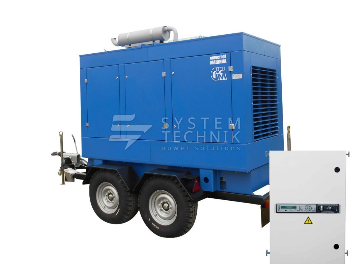 - ССМ ЭД-150-Т400-2РКМ2 в шумозащитном кожухе на шасси с АВР на прицепе